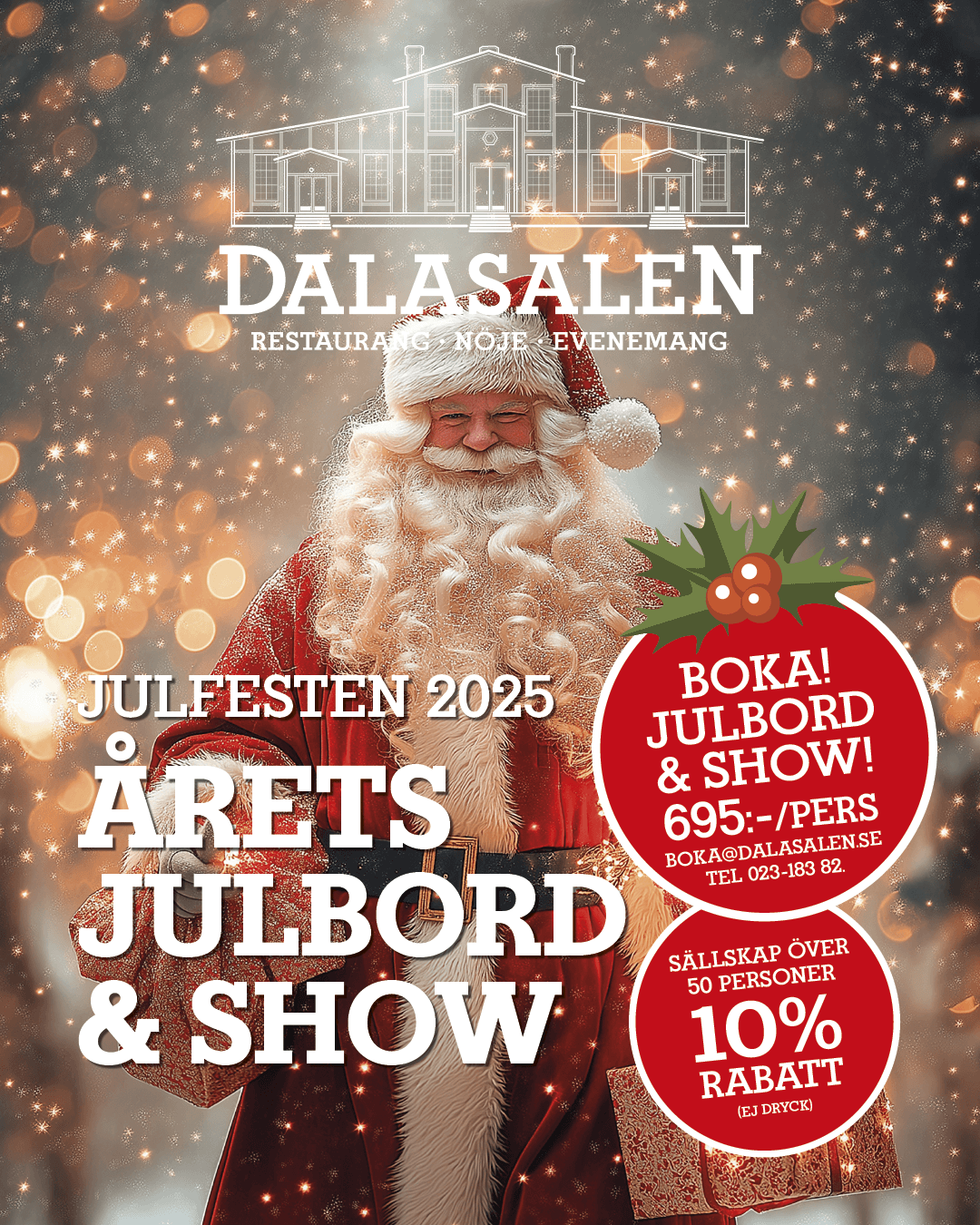 Ring oss på 023-18382 eller mejla till boka@dalasalen.se för att säkra din plats på årets mest efterlängtade julbord i Falun. Oavsett om du vill arrangera en företagsfest, samla släkten eller bjuda dina vänner på en oförglömlig kväll, är du varmt välkommen till Dalasalen.