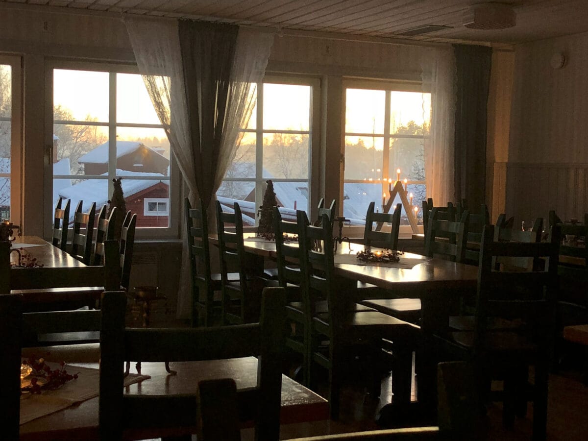 Lunch och middag kan avnjutas i matsalen bredvid. Det är bara att dra bort draperierna så är det uppdukat och klart.